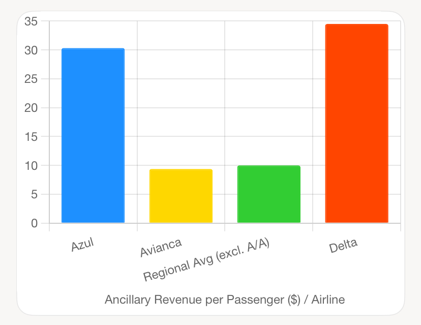 This chart underscores the gap: while Azul and Delta approach parity with global leaders, the regional average lags significantly. With South America’s passenger traffic estimated at over 200 million annually (per the 2024 Big Book of Airline Data), even a modest increase to $20 per passenger could unlock $2–3 billion in additional revenue – funds critical for fleet modernisation and network expansion.